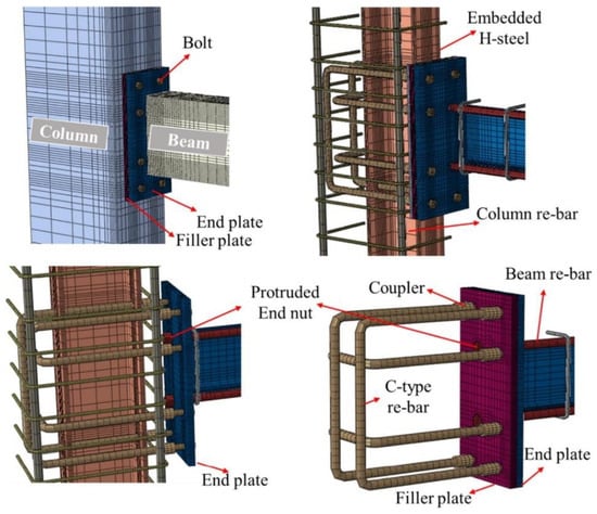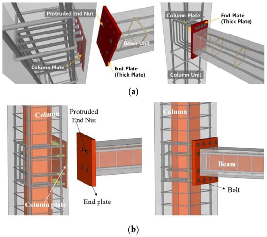 Nzabonimpa et al. [7] used steel connectors embedded in the beam and column to build the joint. They tested the joint in both RC frames and steel–concrete composite frames, as shown in Figure 2. The beam end plates and the couplers cast in the column were connected by high-strength bolts. The construction speed of this joint remains comparable to that of steel frames.