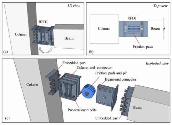 Moreover, some other devices can also be introduced in dry connections. By incorporating dampers between the steel plates, the energy dissipation capacity of the joint can be enhanced. Additionally, by connecting the steel plates for different components using hinge pins, hinge joints can be created. Yang et al. [10] proposed a rotational friction dissipative joint for the purpose of dissipating energy, as shown in Figure 5. A friction pad was fixed between the column connector and beam connector using pre-tensioned bolts and a pin. This joint provided simple details, adjustable performances, and desirable seismic performances. Its nonlinear behavior was determined by the frictional hinge. The material, quantity, and geometric properties of the friction pads or the pretension load of the bolts can adjust the frictional hinge. According to the test, the rotational load–displacement relationship of the joint demonstrates its ability to exhibit ideal elastoplastic behavior.