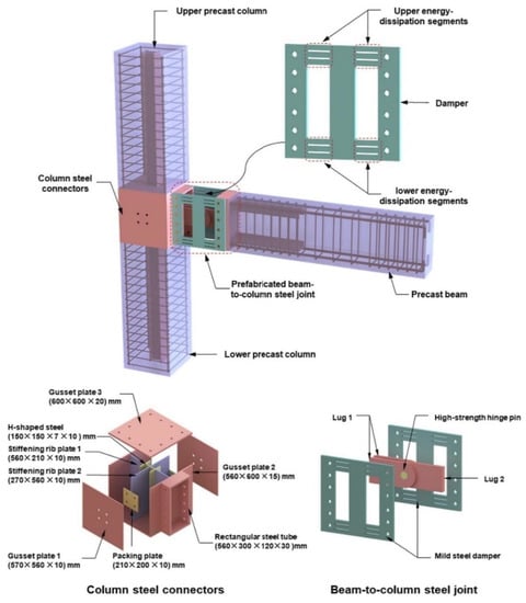 Li and Qi [11] used steel connectors equipped with dampers, lugs, and high-strength hinge pins in the joints, as illustrated in Figure 6. Perforated steel plates were used as dampers, which were connected to steel plates. The proposed steel joint provided several benefits, including sufficient initial stiffness and an excellent capacity for energy dissipation. Experimental tests confirmed that this joint could ensure the plastic hinge occurring in the beam, and exhibited a better hysteretic performance, higher energy dissipation, and greater ductility than a monolithic joint.