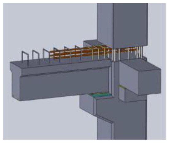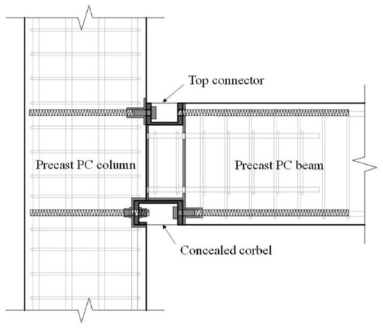 An additional option involves the use of corbels to support beams on columns. Zhang et al. [12] utilized a corbel, as illustrated in Figure 7. The beams were connected to the column using connectors, dowel bars, and high-yield reinforcement bars. This joint was easy to assemble and disassemble, allowing for efficient component upgrading and replacement. According to the tests, the failure modes of the joint satisfied the strong-column weak-beam principle.