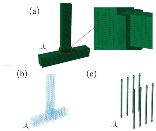 FEM model of Ding et al.: (a) concrete mesh; (b) rebar mesh; (c) bolt mesh (reprinted from [14]).