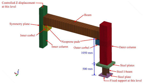 Elsanadedy et al. [15] built a model of the specimen tested in their experiment. By taking advantage of its symmetrical properties, the model was built in half, as shown in Figure 10. Solid elements were used for modeling all the components, but rebars were modeled using truss elements. The smeared crack model was designated for concrete. The steel plates and angles at the beam–column connections were constructed using a designated isotropic hardening material. The steel rebars were modeled using a piecewise linear plasticity model.