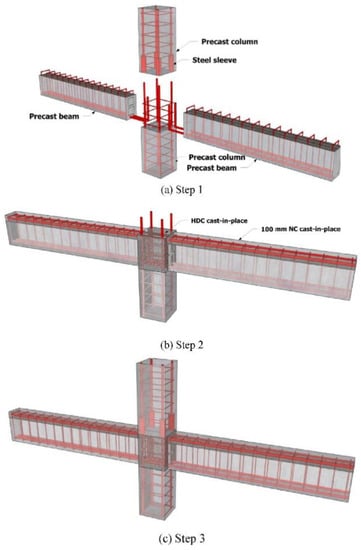 Deng et al. [16] used cast-in-situ concrete to connect precast beams and bottom precast columns, as shown in Figure 11. The longitudinal bars of the beam had a 90-degree hook, which was intended to be cast in the joint. Steel sleeves were utilized to connect the protruding steel from the joint, thereby connecting the upper column and the joint. In different specimens, joints were cast using highly ductile fiber-reinforced concrete and normal concrete in order to study the impact of material strength on the failure modes. The test results showed that the utilization of highly ductile fiber-reinforced concrete in precast concrete beam–column connections improved both their shear capacity and damage-tolerance capacity significantly.