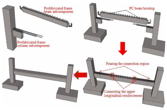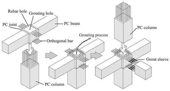 Breccolotti et al. [18] used fiber-reinforced concrete to connect beams and columns in the joint. A comparison was made between the structural behaviors of the joint and a cast-in-situ joint, and comparable mechanical performances were found between the two types of joints. Yan et al. [19] studied a joint with beams installed in two directions. Specifically, one beam was installed on the bottom column continuously, where the protruding reinforcement from the bottom column passed through the pre-reserved holes of the beam, as shown in Figure 13. High-performance grout was poured into the holes. In the orthogonal direction, concrete was cast on site to connect the beams and column, where the reinforcement bars were connected by sleeves. The upper precast column was connected to the joint by using grouted sleeves. The test results showed that the joint exhibited good seismic performance on par with that of cast-in-situ connections. Furthermore, the grout sleeve, cast-in-situ region, and rebar holes were found to significantly impact both the plastic hinge and the core regions’ seismic behaviors.