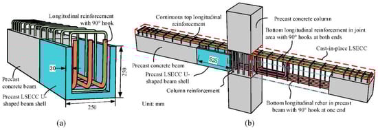 Gou et al. [21] conducted further research on the use of U-shaped beam shells by utilizing ultra-ductile, low-shrinkage Engineered Cementitious Composite (ECC), as shown in Figure 15. The use of ECC effectively controlled the drying shrinkage while preserving the high ductility and multi-cracking characteristics. Partially substituting concrete with low shrinkage ECC can notably enhance the seismic performance and damage tolerance of beam–column joints, while also simplifying reinforcement details in the joint zone.