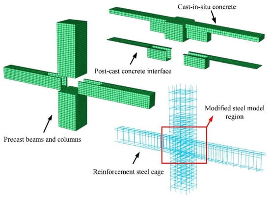 For the wet connections, researchers have also developed some numerical methods to predict their mechanical performance. However, because the integrity of the joint is compatible with the monolithic joint, their numerical simulation method is also similar. Feng et al. [22] utilized FEM to analyze the specimens in their experiment. The beams were manufactured using a U-shaped beam shell, as illustrated in Figure 16. The numerical models were divided into four parts, i.e., precast beams, precast columns, cast-in-situ concrete, and an interface layer. Solid elements were used to model the components, except for reinforcement bars, which were modeled using truss elements.