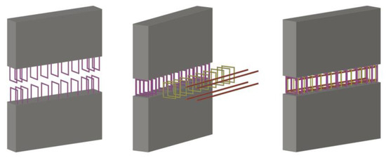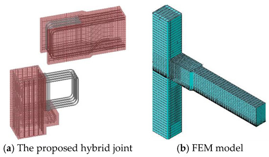 Breccolotti et al. [37] proposed a hybrid joint, in which the beam ends were gradually widened and two rectangular prismatic elements called “shoulders” were created. The shoulders were positioned on the brackets of the column, and then fixed by pouring fiber-reinforced concrete into the space between the shoulders, as shown in Figure 21. The use of loop splices and cast-in-situ concrete with steel fibers improved the ductility of the wet joint, while also ensuring high strength and simplicity in construction. Moreover, FEM was adopted for the numerical study. Solid elements were used to model concrete, and truss elements were used to model reinforcement bars. Since the joint exhibits excellent integrity, no specific constraints were introduced in order to model the contact between the various components.