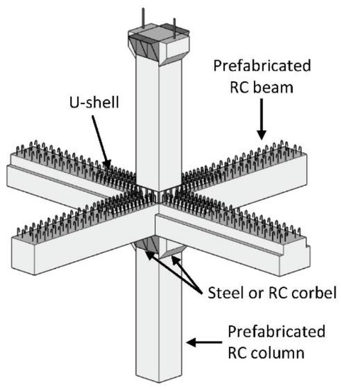 Fan et al. [38] proposed a similar hybrid joint using a U-shaped beam shell at the end of the beam, supported on the corbels of the precast column, as shown in Figure 22.