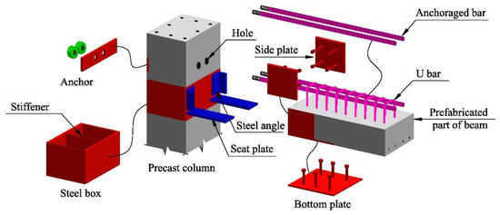 Esmaeili and Ahooghalandary [40] proposed a hybrid connection comprising a dry type for the lower part and a semi-monolithic type for the upper part, as shown in Figure 24. A steel box with a stiffener was utilized in the precast column to prevent out-of-plane buckling. The beam comprised two segments, i.e., the lower precast segments and the upper in situ segments. The precast portions were anchored to the concrete of the beam end using headed studs. After installation, the upper part of the beam was cast. Its dimensions were suitable for transportation and installation, making it practical for on-site assembly. For this joint, seat plates were easy to assemble, without the need for tight tolerances to achieve precise results in construction.