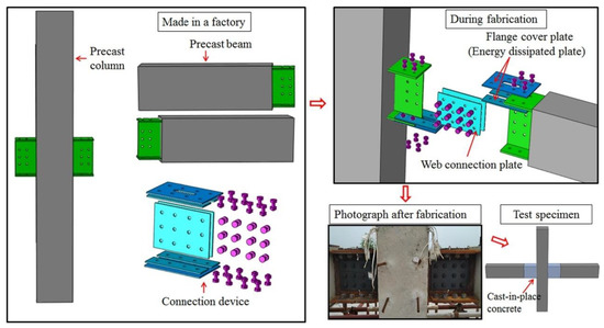 One commonly used dry connection method involves utilizing pre-embedded steel plates and bolts to connect beams and columns. Ye et al. [6] used I-sectional steel plates, high-strength bolts, and cladding steel plates to create beam–column joints, as shown in Figure 1. The test results indicated that the joint could mitigate the stress concentration. The bearing capacity and energy dissipation were found to be dependent on the length of the cladding plates.