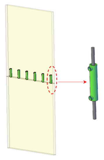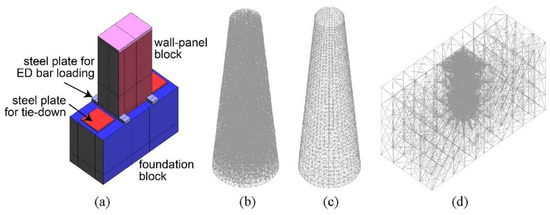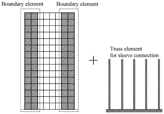 For the wall–panel connections, Xu et al. [69] utilized structural elements in their simulations, as shown in Figure 42. The shear wall specimens were numerically simulated using a multi-layer shell element model. Truss elements were used at the boundaries to simulate grout-filled sleeve connections.