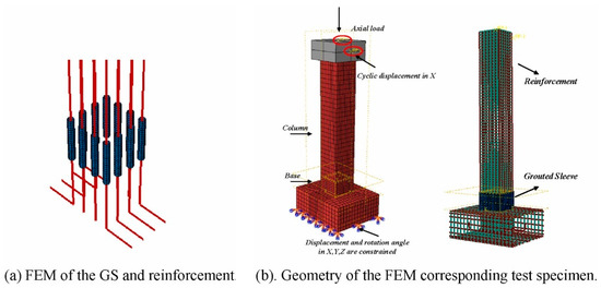 By using FEM in a parametric study, Xu et al. [23] studied the mechanical properties of the joint, including the load-carrying capacity, deformation capacity, plastic hinge length, and rotation caused by bond slip. Li et al. [24,25] used constant-stress solid elements to model the concrete and interface layer and used beam elements called Hughes–Liu elements to model the sleeves and rebars. They compared the dynamic responses of monolithic and precast concrete joints under impact loads. In addition, parametric analyses were performed, in which factors such as the impact energy, the inclination angle of the drop weight, and concrete strength were considered.