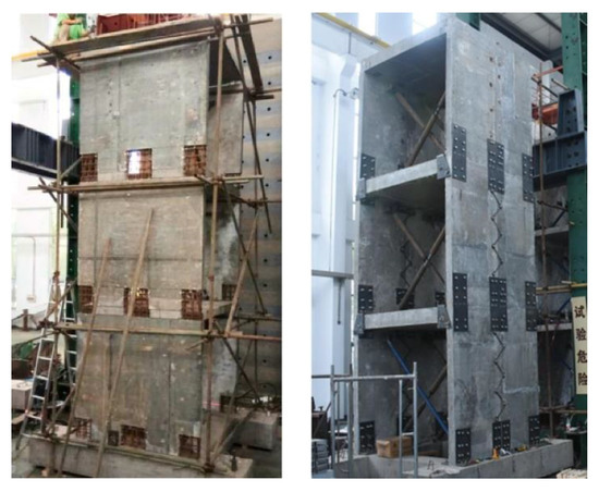 Guo et al. [65] proposed a low-rise precast wall–panel structure using bolts, as shown in Figure 39. The system utilized dry connections between concrete walls to create a box structure that transferred both gravity and lateral loads. A 1/2-scaled three-story model was constructed for the shaking table test. The findings indicated that high-strength bolt connections are crucial for initial stiffness and dynamic responses. The structure exhibited minimal damage, with most components remaining elastic. The sliding of the floor slab was significant, while precast walls showed minimal lateral deformations. Fragility curves were derived for different damage limit states, indicating a low probability of structure collapse. It is recommended bolt connections are improved and the structural system is optimized in order to reduce acceleration responses and potential economic losses.