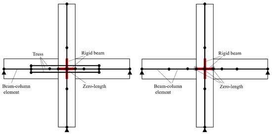 When it comes to numerical simulations on the structural level, the methods used to simulate column–foundation and wall–panel connections are quite similar. In structural analysis, refined models are often difficult to work with due to their high computational requirements. Structural elements, such as shell and beam–column elements, are commonly used in the modeling. Structures assembled using wet connections, which behave similarly to cast-in-situ structures, do not require the special treatment of connections and can be simulated using conventional techniques for cast-in-situ structures. However, structures assembled using dry connections behave differently. In the following section, some simple structural elements for dry connections are presented. El-Sheikh et al. [66] proposed two models, i.e., a fiber model and a spring model, to simulate the dry connections, as shown in Figure 40. In the fiber model, rigid end zones are employed to model the joint panel zone that is connected to the beam–column elements. A zero-length spring element is introduced to capture the panel zone shear deformations. Furthermore, truss elements and two rigid links are utilized to simulate unbonded post-tensioning steel. The spring model utilizes a zero-length rotational spring element to simulate the nonlinear behaviors of the unbonded post-tensioned precast beam–column connection, replacing the fiber and truss elements used in the fiber model.