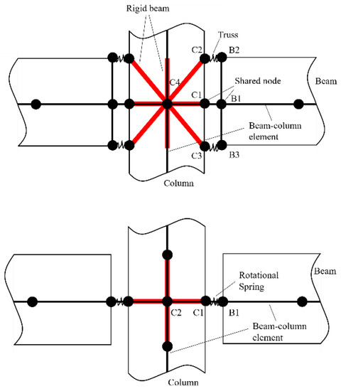 Kim et al. [67] proposed two types of nodes to simulate the “beam growth” in precast buildings, as shown in Figure 41. In the first model, the joint is modeled using seven nodes, while the connecting section of the beam is modeled using four nodes. Six nodes are rigidly linked to the central node C4 for the joint. The model does not account for joint deformations. To transfer the moment using axial forces, a tri-linear model was used to link the beam and column at the interface. Node B2 and Node C2 are linked with horizontal springs, as well as Node B3 and Node C3. Additionally, very stiff vertical springs at Nodes B1–C1 are utilized to transfer the shear force across the interface in the vertical direction. The second model simplifies the first model by replacing three nodes and elements with a rotational spring at the interface. Similarly, Ozden and Ertas [68] also utilized a tri-linear idealization to model the interface of the beam–column connection.