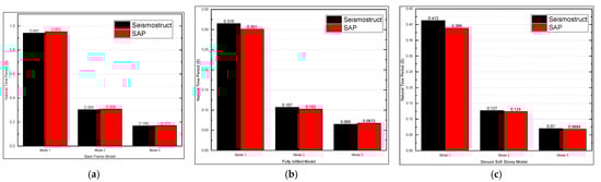 Time period of three-story models for a dead load of 9 kN/m2: (a) 25 MPa; (b) 40 MPa; and (c) 55 MPa.