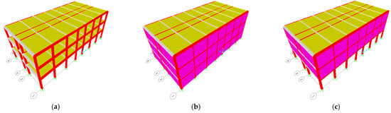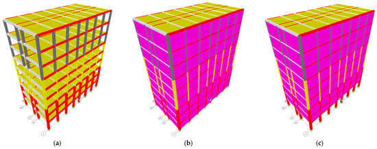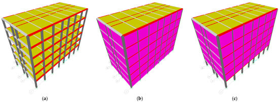 Six-story models: (a) bare frame; (b) fully infilled; and (c) ground soft story.