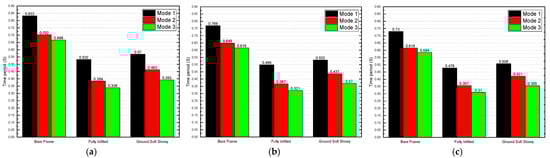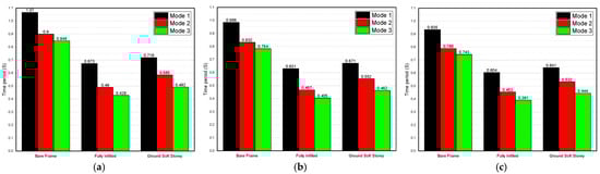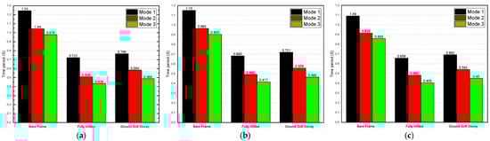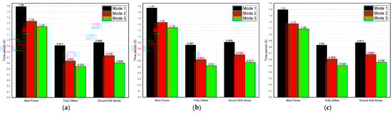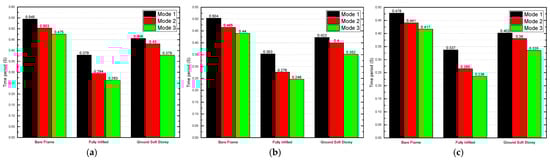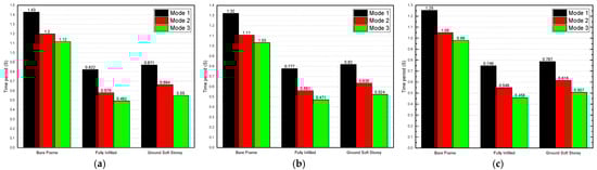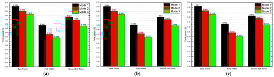 Time period of three-story models for a dead load of 6 kN/m2: (a) 25 MPa; (b) 40 Mpa; and (c) 55 Mpa.