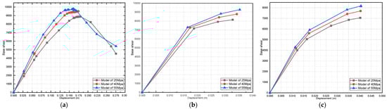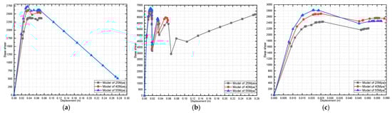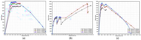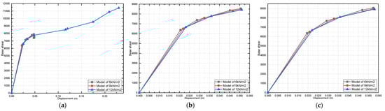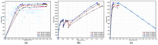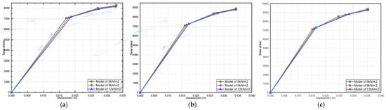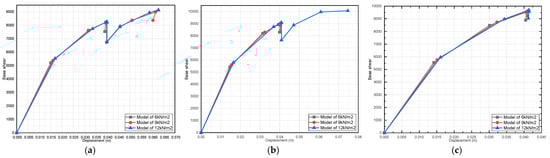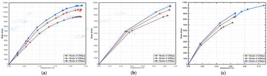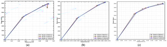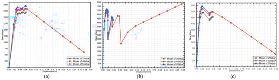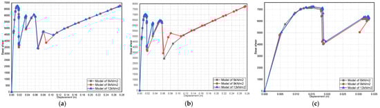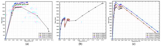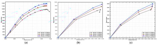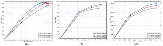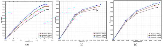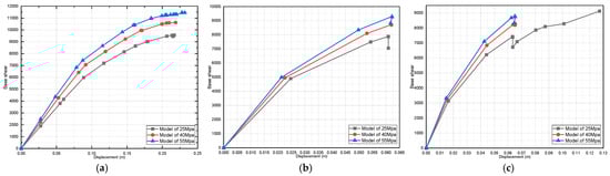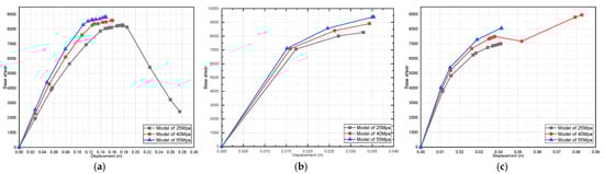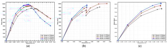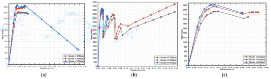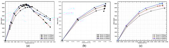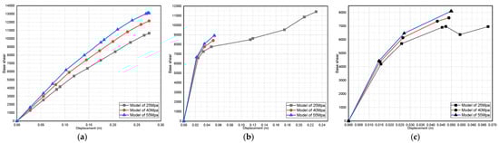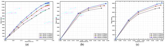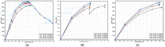 Effect of dead-load variation on a three-story pushover curve (fully infilled models in X direction): (a) 25 MPa; (b) 40 MPa; and (c) 55 MPa.