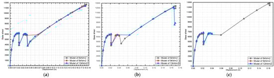 The third model (micro-model) [,,,,,] requires the explicit modeling of all components of the masonry infill wall, taking into account the interaction of the wall components, as well as the interaction of the frame elements with the wall. This model is considered the most accurate model based on the extended modeling of the different elements, but in return, it requires more effort and time to analyze and present the results.