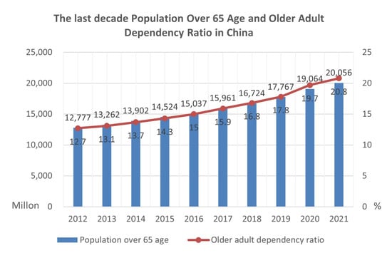 Since 1982, China has had a state policy of family planning to control the country’s total population, which means that a family can only have 1 child. Now, 30 years later, this policy has resulted in a situation where most older adults will have to face living alone; moreover, the elderly population is increasing year by year, and the dependency burden of young people is growing gradually, with the elderly dependency ratio rising from 12.7% in 2012 to 20.8% in 2021 [], an increase of 8.1% (Figure 1). A growing number of seniors over 65 has resulted in China having the most older adults in the world. The number of seniors over 65 has increased by 72 million over the past decade to reach 200 million [], 14.2% of the country’s total population. It is clear from these figures that the issue of older adults has become pressing in China and one that is faced by both China and the rest of the world.