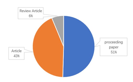SHFTE publications have increased over the last decade, as shown in the statistical chart (Figure 2); the highest number of publications was in 2020, with 139. The year with the most citations was 2021, with 130 publications and 3159 citations. This trend indicates that research on SHFTE has gained significant academic interest in the last five years. Journal articles comprise 51% of publications, conference papers comprise 44%, and review articles comprise 6% (Figure 3). The United States (n = 137), China (n = 116), and Italy (n = 74) are the top 3 producers of publications, accounting for 13.25%, 11.22%, and 7.20% of total publications, respectively (Table 2). A majority (51.7%), a large percentage (42.46%), and a small percentage (14.7%) of the publications pertain to computer science, engineering, and telecommunications (Table 3). The top three authors with publications in this field are Mukhopadhyay SC; Goubran R, Knoefel F, and Yasumoto K; and Suryadevara NK and Vanus J (Table 4), and a list of the top five organisations with the most publications in this field is shown in Table 5.