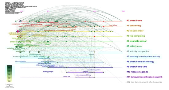 The keyword cluster network diagram (Figure 4) aims to cluster these 1034 documents according to the keywords in the abstract, title, and topic, with the colour overlays representing the intersection of the documents between the different clusters. Time is reflected in each dot; the size of the dot reflects the number of relevant documents, and the publication time of the literature ranges from early (yellow) to recent (green). The largest cluster is 0# smart home (CiteSpace is sorted by cluster size starting from 0). The clusters with high academic relevance to this cluster are #9 smart home care, #10 research agenda, #2 visual sensor, and #1 daily living. Moreover, “ambient intelligence” is represented by a large red circle, which means that this keyword has emerged in recent years and has attracted much interest from researchers. In addition, keywords closely related to smart homes are “home automation”, “recognition”, “machine learning”, “Privacy”, and “assistive technology”. This shows that, with the combination of IoT and smart homes, researchers are not only concerned with technological advances but also with the security and privacy issues associated with these emerging technologies. Wearable technology embedded with IoT offers a direct link between the smart home and smart city for older adults, which may be an emerging research direction with broad application prospects.