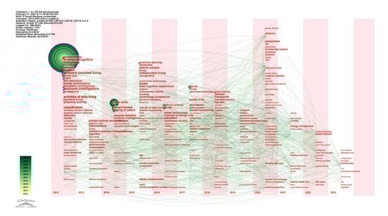 The timeline (Figure 5) also shows that cluster #0, which has been ongoing since 2012, is closely linked to all clusters, especially to clusters #1 and #2, mainly in terms of “care”, “adoption”, “recognition”, “deep learning”, and other keywords. It can also be seen that many of the keywords that first appeared in 2012 have continued to be studied until this year, indicating that 2012 was a more active year for research.