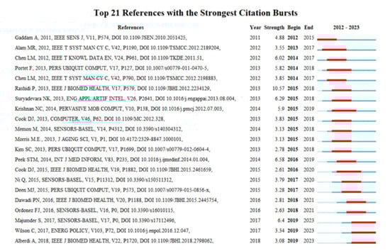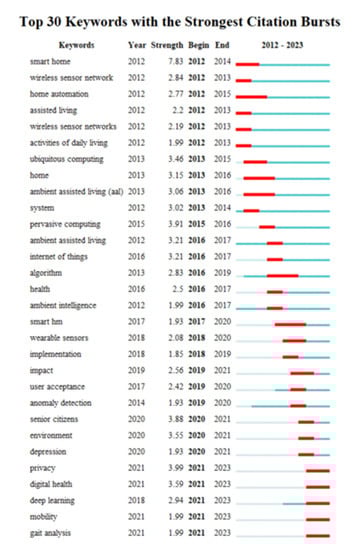 Keyword bursts can reflect changes in research topics and hotspots. The top 30 most-cited keywords from 2012 to 2023 are shown in Figure 7, with the Strength value indicating the intensity of the keyword cited and representing the number of studies related to the keyword. Strength is the most significant keyword for smart homes (7.83), which first appeared in 2012 and lasted until the end of 2014. It is worth noting that “privacy” (3.99) is the most recent keyword in 2021. Digital health (3.59) continues until 2023, indicating that with the development of smart technology, the security of information in the Internet of Things is recently receiving attention from researchers. Digital healthcare is also a recent research hotspot. Additionally, deep learning, mobility, and gait analysis are all research hotspots related to smart technologies, indicating that the upgrading and development of smart technologies also continue to grow.