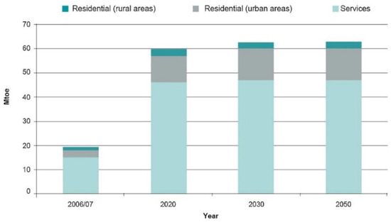 Buildings currently account for 25% to 30% of all energy use, leading to substantial carbon emissions that are well on their way to 50% over the next three decades, stressing the need to improve their energy efficiency [7,8]. According to the findings, space heating and cooling demand accounts for approximately 75% of all energy utilized in single and multi-family homes [9], which may increase threefold over the next three decades, demanding immediate energy efficiency interventions to mitigate the risk of which reducing peak time energy demand through TES seems very promising [10,11,12,13]. Anticipated cooling demand has been presented in Figure 1 [12].