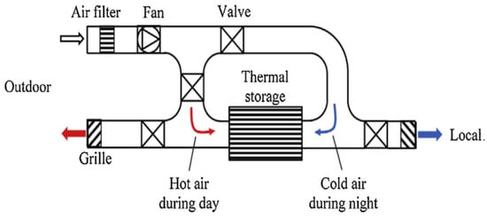 The fundamental concept of a free cooling system that utilizes PCM can be divided into two distinct modes of operation, as shown in Figure 4: During the night, when the outside temperature is lower than the building interior, the PCM solidifies until thermal equilibrium between the PCM and the outside temperature is established. During the daytime, the warm air flows through the storage unit, where it releases heat to the solid PCM, causing the melting process to begin and cooling the air to be served indoors [67].