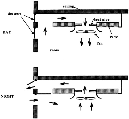 Free cooling exploits the tremendous cooling potential available in the cold nighttime air by mechanically circulating the cold air into a heat storage unit, typically involving PM, to charge or discharge the unit through latent heat absorption and release. In most cases, a daily average temperature swing of 12–15 °C has been observed between day and night ambient temperatures, which perfectly matches the temperature window for absorption and release of heat through PCM by carefully opting for a suitable PCM melting point reportedly between 19–24 °C [65,66].