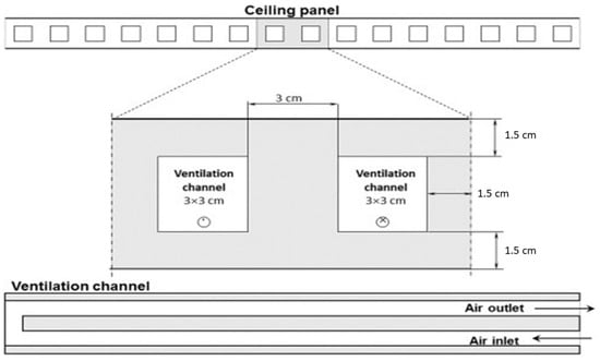 The scheme of the repetitive elements of a ceiling panel, dimensions of the experimental set-up, reproduced with permission of [84], Elsevier, 2014.