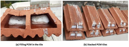 Roy et al. [95] studied a novel design of an air-PCM heat exchanger, reporting a maximum temperature difference of 1.4 °C and a cooling effect of 2.05 kWth, reducing the air conditioner capacity by 13% to 46%, depending on ambient temperature. Baskar and Chellapandian [96] conducted a study on a form-stable PCM-based roofing system applied to hollow clay tiles with polymer cement mortar and expanded perlite for stability, as shown in Figure 12. They reported an interior temperature drop of 8–10 °C.