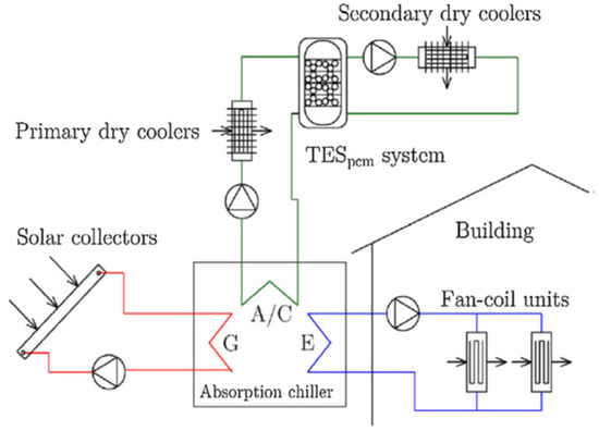 A solar cooling system comprising of TES PCM and dry coolers, reproduced with permission of [110], Elsevier, 2014.
