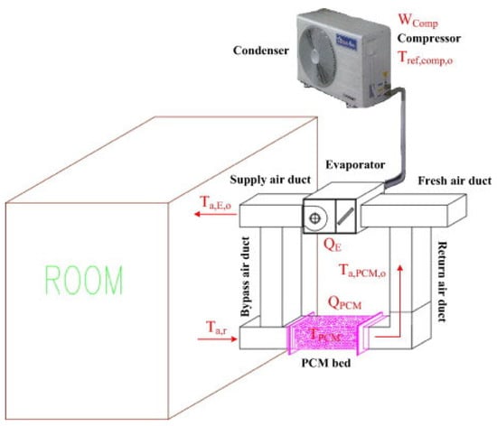 A schematic diagram illustrating an air conditioning system incorporating PCM, reproduced with permission of [119], Elsevier, 2015.