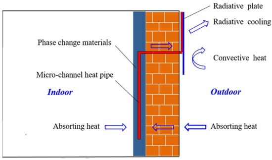 Micro-heat pipes, radiative cooling, and PCM were all incorporated into a single wall by Yu et al. [124,125]. When a micro-heat pipe is installed in the wall, the PCM solidifies much more quickly. When compared to a standard brick wall, an annual energy savings of 18.2% was reported. Wang et al. [126] evaluated a combination of cooled ceiling, micro-PCM slurry, and radiative cooling in five climatic regions in China, reporting increased energy efficiency.