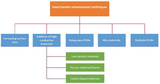 One of the most important challenges to effectively utilizing PCMs for cooling and heating remains the heat transfer rates, which significantly impact the efficacy of these systems. Lower heat transfer rates significantly delay the melting and solidification of the PCMs, which is mainly attributed to lower PCM thermal conductivity [128,129,130]. Several interventions have been investigated to enhance heat transfer, including conductive nanoparticles, extended heat transfer surfaces, porous materials, and high-conductive fiber materials [131,132,133,134,135], as summarized in Figure 22.