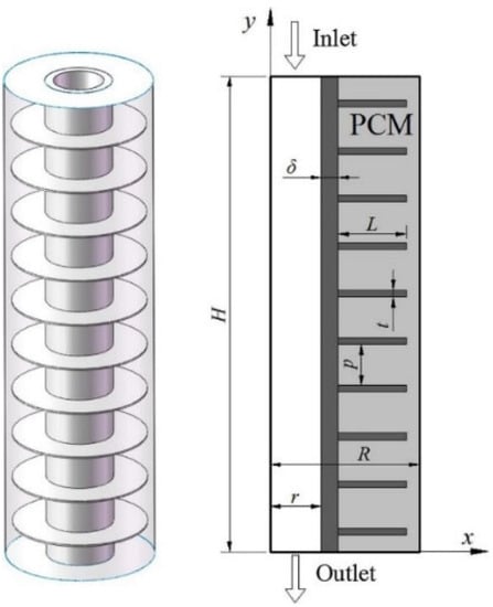 - Pu, L.; Zhang, S.; Xu, L.; Li, Y. Thermal performance optimization and evaluation of a radial finned shell-and-tube latent heat thermal energy storage unit. Appl. Therm. Eng. 2020, 166, 114753. [Google Scholar] [CrossRef]