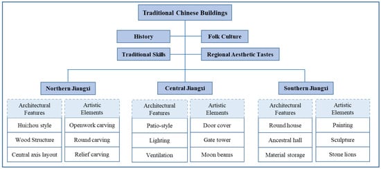 Three steps were conducted to investigate and explore traditional architectural features and artistic elements in different regions of Jiangxi. Firstly, based on the history, culture, traditional skills, and regional aesthetic tastes, we divided Jiangxi Province into three regions to study. Secondly, the typical structures, layouts, and styles were analysed to indicate the architectural features through fieldwork. Thirdly, we analyse the artistic elements, showing the characteristics of traditional craftsmanship and human wisdom. The structure of the research is shown in Figure 1.