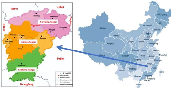 According to geographical and social characteristics, the traditional buildings in Jiangxi are divided into three major regions: northern, central, and southern Jiangxi, as shown in Figure 2. There are many provinces bordering northern Jiangxi. The representative cities of northern Jiangxi buildings include Jingdezhen, Shangrao, and Yingtan, where the artistic features are greatly influenced by the architectural art in Anhui. The traditional buildings in central Jiangxi are not influenced by other provinces, and are the most representative buildings of Jiangxi’s style. The representative cities in central Jiangxi are Ji’an and Yichun, where architectural art is relatively restrained and practical, simple, and elegant. Finally, the representative city in the south is Ganzhou, which is also the gathering place of the Hakka people. The architectural characteristics are mainly represented as enclosed buildings with typical Hakka culture.