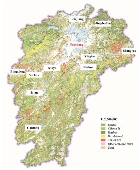 The northern area of Jiangxi is located on the south bank of the middle and lower reaches of the Yangtze River at the intersection of Hubei, Anhui, Zhejiang, and Jiangxi. The landform types are mainly mountains and hills. Mountains account for 36% of the provincial area, including famous Taoist resorts such as Mount Lu, Mount Longhu, and Mount Sanqing. It is also an area rich in forests. According to the public information of Jiangxi, the detailed distribution of natural resources is shown in Figure 3 (the source of information is the Department of Natural Resources of Jiangxi Province). Benefiting from abundant local timber resources, wooden buildings in northern Jiangxi are common. The wood frame materials used in the northern buildings are very particular, and the workmanship is rigorous and fine. The area is also rich in valuable tree species suitable for architectural decoration and carving, such as camphor, sassafras, mulberry, nan, maple, and ginkgo, etc. Due to its geographical location, the culture in northern Jiangxi is dominated by traditional Confucian and Taoist cultures. Traditional buildings in northern Jiangxi have typical Huizhou characteristics. Most of the architectural wood carvings are very exquisite, and the content mostly describes the classics of Confucianism and Taoism with rich patterns and fine carvings.