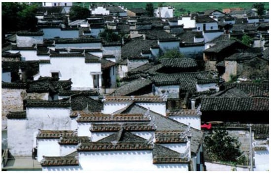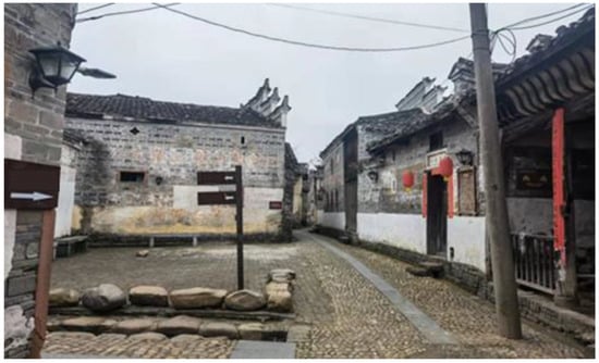 After years of development, the model dwelling of northern Jiangxi was established in the Ming and Qing Dynasties. Today, observing the ancient buildings left over from the Ming and Qing Dynasties in the mountainous areas of northeastern Jiangxi and the whole area around Poyang Lake, the architectural features are greatly influenced by the Huizhou style. As shown in Figure 4, taking Likeng Village in Wuyuan, Jiangxi as an example, the original features are well preserved because Likeng Village is relatively remote. The local scholars, officials, and merchants who returned to their hometown built houses to reflect their prestige. The shape and scale of the buildings reveal a rich and elegant atmosphere that is different from ordinary villages. The architectural model is influenced by the concepts of “clan, official rank standard, Huizhou merchants”, etc. The phenomena of “Confucians first and then merchants” and “equal emphasis on merchantry and Confucianism” embody the unique Huizhou architectural form. Likeng Village is surrounded by mountains and rivers. The beauty of Huizhou architecture is deeply hidden in quiet and remote places. It is natural, quaint, secluded, and integrates the essence of customs and culture []. Specially, He et al. [] researched water environments as an important design of living environmental space. Use of water environmental spaces in Huizhou architecture has many components, and water environments of various shapes have penetrated into each part of ancient architecture. These factors can be classified into three categories, which are linear factors, spot factors, and surface factors.