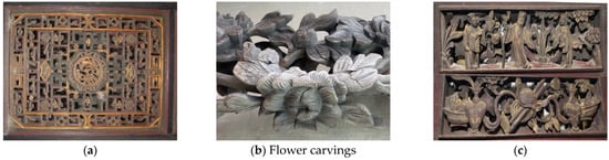 The Hui-style carvings on the traditional houses in northern Jiangxi add dazzling brilliance to the buildings, making it both practical and aesthetically sublime. The ingenious ideas of sculptors lends the carvings an active and flowing atmosphere. Techniques such as openwork carving (Figure 6a), round carving (Figure 6b), and relief carving (Figure 6c) are mainly used to decorate gate towers, door covers, windows, screens, railings, and furniture, etc. The beauty of nature is integrated into the sculpture, which also realizes the transformation from natural beauty to artistic beauty. From the Ming Dynasty to the Qing Dynasty, the art of the three carving techniques changed from simple to complex and from plainness to luxury, depicting the beauty contained in social life. The themes of the carvings include the historical figures of Confucianism, Buddhism, and Taoism, flowers and plants, auspicious animals, decorative patterns that imply values like truth, goodness, and beauty, etc. Double-sided reliefs carved on top of reliefs have appeared in the houses of some rich families who had a high demand for exquisite woodcarving, as shown in Figure 6c. The relief is divided into two sides. The front shows the image of the eight immortals, and the back shows the utensils held by the eight immortals. Figure 7 tells the story of the traditional Chinese Taoist legend “Eight Immortals Crossing the Sea”. The Eight Immortals used their own instruments to show their skills and cross the East Sea by using their abilities. Teiguai Li threw his wine gourd, Zhonggli Han jumped on his big palm-leaf fan, Dongbin Li threw his sword, Caihe Lan threw his flower basket, Xiangu He used her lotus, Guolao Zhang went down to the sea on his donkey, and Guojiu Cao took his jade tablet to avoid the water. Finally, the Eight Immortals crossed the East Sea. As a symbol, it implies good luck, peace, and well-being, and expresses a desire for a better life.