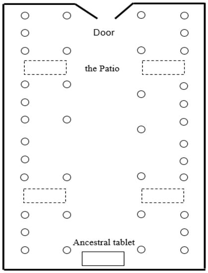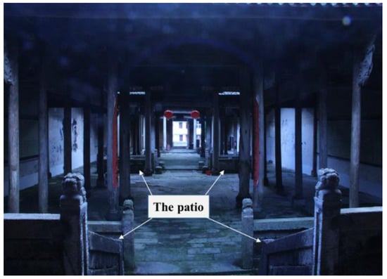 The architectural style of most traditional buildings in central Jiangxi is centred on the patio. The Liu Family Ancestral Hall in Liufang Village, Jiangxi, is a traditional clan ancestral hall built in the 7th year of Ming Hongzhi (1494) that was used by the clan to worship ancestors and sages. The ancestral hall is magnificent and spectacular with carved dragons and painted phoenixes. The golden plaque inscribed with “Famous Patrons of Jiangxi” was bestowed by Zhu Shi, a teacher and scholar of the Qing Dynasty, but today all that remains is the gate tower. The gate tower is magnificent and majestic. The ancestral hall is large in scale, including five buildings and one bedroom. According to the combination of the architectural space of the ancestral hall, four patios are arranged, as shown in Figure 8. The patio of the ancestral hall belongs to the interior space of the dwelling enclosed by the front hall, rear hall, and other rooms. The rooms are linked by their roofs. The location of the four patios in the ancestral hall is very special. The patios are arranged on both sides of the central axis of the ancestral hall, as shown in Figure 9, which not only meets the requirements of ventilation, drainage and, lighting inside the ancestral hall, but also does not affect the passage of people along the central axis. Meanwhile, it is convenient for large-scale sacrificial activities in the ancestral hall. Zhou et al. [] explored the correlation between ancestor temple worship sacrifice culture and clan etiquette in traditional buildings of Jiangxi. To some extent, the ancestral hall reflects that the traditional buildings of Jiangxi were used for ancestor worship, as well as religious activities. However, this is different from European religious beliefs, and its rich connotation is embodied in traditional clan cultural ideas such as “blood relationship” and “filial piety”. The patriarchal clan had a great influence on the family in ancient China. The popularity of ancestral temples and ancestor worship enhanced the centripetal force and integration force of clans, which is of great significance for inheriting history and stabilizing rural grass-roots organizations [].
