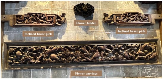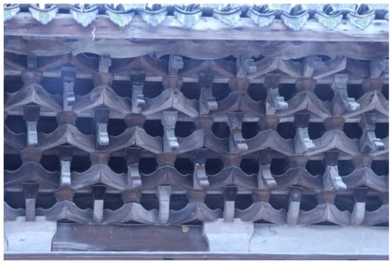 The simplicity of central Jiangxi’s architectural art is also reflected in the outer walls, as shown in Figure 11. The height of buildings in central Jiangxi is generally lower than those in Huizhou. The decoration of the roof overhangs is simple, and there are no exquisite external windows. Some higher quality buildings use a gate tower at the entrance and usually build the open room with brick or stone. Various architectural components in the interior of the dwelling, such as bucket arches, side beams, column foundations, indoor ceilings, split doors, and windows, often use many exquisite and complicated carvings to form complex shapes, as shown in Figure 12. These decorations are hidden inside the dwelling and can only be seen inside the house, which reflects the philosophy of restraint in the lifestyle of the Jiangxi people. It is the essence of traditional architecture in central Jiangxi.