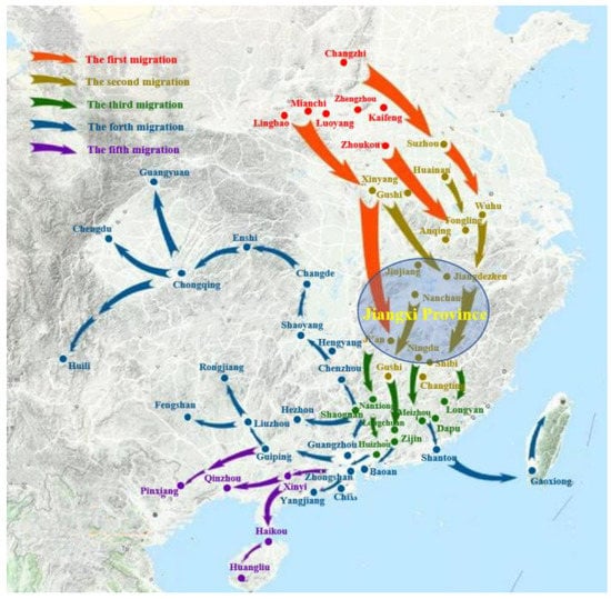 Ganzhou occupies most of the southern part of Jiangxi. The south of Ganzhou features a stronghold of immigrants in Chinese history. It belongs to the cultural circle of the Hakka people and is one of the three major Hakka cultural settlements in southern China. Hakka refers to Han people who were forced to migrate to the south due to wars and famine from the Jin Dynasty to the Southern Song Dynasty. When local officials in the south registered these immigrants, they set them up as “guests”, calling them “customers” or “Hakka”. The name Hakka came from this, and they eventually formed unique cultural traditions. Several large-scale southward migrations of the Hakka people were carried out during turbulent historical dynasties. In history, there were five large-scale migrations that gradually formed the Hakka people today. As shown in Figure 13, the Hakka of Jiangxi were mainly formed during the second migration. Migrating people tended to move south with the whole family. Over their thousand-year historical evolution, the Hakka people have continually developed and grown, and still retain their original characteristics today. In different periods, the Hakka people migrated to different regions, forming unique cultures and architectural styles. Hakka buildings in southern Jiangxi have commonality and individuality with those in western Fujian and northeastern Guangdong. The southern Jiangxi area at the border of Jiangxi and Guangdong is located in a remote mountainous area. Due to the dangerous natural environment and turbulent social environment, there is often harassment by bandits and gangsters and clan fights. The reach of the government’s legal authority is weak. To adapt to the local natural and social environment, the Hakka people, through long-term exploration and practice, invented the technology of building hard rammed earth walls with fine sands and crushed stones, and have gradually selected and built a form of settlement, the round house, that is suitable for the local environment of southern Jiangxi. Tulou and the round house are both forms of Hakka buildings and have a certain historical relationship with the Hakka migration. Similar to the geometric shape of the Tulou, the round houses in southern Jiangxi have excellent cultural value and sustainability. Its architectural structural model can be replicated and verified in Hakka traditional buildings in western Fujian and eastern Guangdong. It can utilize the surrounding environment and is suitable for human production and life [,,]. Similarly, the northeastern in China and the nomads in northwest China, they make full use of local forest resources and animal furs as original materials to construct buildings that adapt to the local climate and environment. Undoubtedly, the wisdom of people that have adapted to nature and integrated into society is fully reflected here.