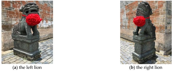 Due to the development and integration of building technology, people use stacked or frame structures to build structures through continuous beams and pillars by combining soil and wood. The creation and development of this component combination mode is not only based on the material itself, but is also based on the natural environment and human behaviour. It can also be understood that this traditional mode originates from the harmonious coexistence between man and nature []. Additionally, wood carvings are generally used on beams (as shown in Figure 16a), pillars, railings, doors and windows (as shown in Figure 17), and lattice fans. The content includes ancient myths and customs, animals representing auspiciousness, longevity and wealth, and historical figures such as dragons, phoenixes, lions, and unicorns. The combination of relief and openwork modes can be adopted. The round houses are generally carved with imitation wood arches. The production of the beam frame is very delicate, with hollow carved flowers, cirrus clouds, auspicious animals, and other graphics, as shown in Figure 16b []. The pillar foundations, door lintels, and accompanying stone lions mainly use stone carving techniques. The shape of the column base mainly includes representations of “longevity”, such as the melon, raspberry, and drum. The relief carvings on door lintels are mainly carved with patterns that imply auspiciousness and safe access, such as elephants, sheep, and curly grass. The stone lions of Xinwei, Guanxi are set on the left and right sides of the entrance of the hall (as shown in Figure 18). The sculptor of the stone lion is ingenious. The male lion holds the official seal under his left foot, which is a metaphor for a man in power. Books, bows and arrows, and copper coins are also engraved under the stone lion, implying that men can be both rich and noble or both civil and military. The lioness is holding an ingot under her left foot, which is likened to a woman holding wealth []. Feminine elements such as combs, fans, and bronze mirrors are also engraved on the bottom, implying the appeal for a better life. Various art forms provide good guidance and reference for the development of modern architecture. For the inheritance and development of traditional buildings, it is also the responsibility and task to further research and understand the traditional culture. The historical and economic value brought by the Hakka round house, supplemented by the Hakka art style, cannot be ignored.