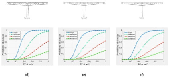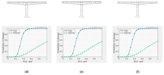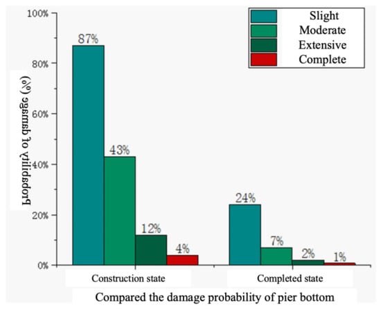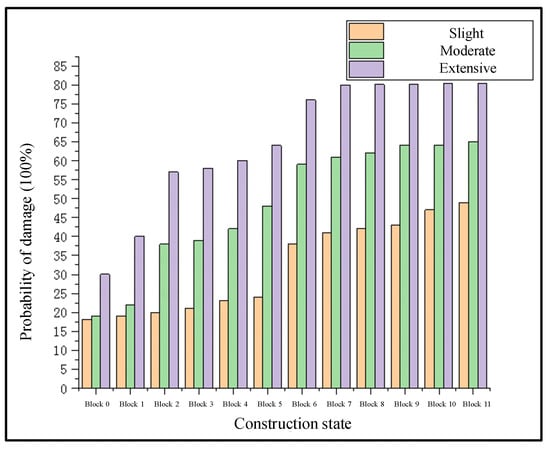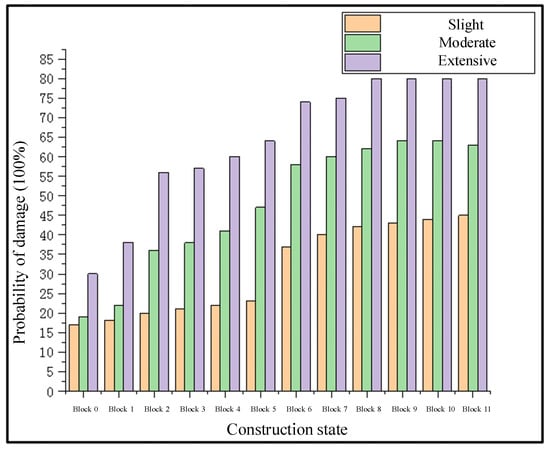 - The damage probability of piers and temporary bearings under construction increases with the progress of construction. The initial formation of the cantilever structure and the size change of the construction girder section corresponds to the greater seismic vulnerability in the construction state, so the seismic damage prevention measures should be strengthened. Vertical earthquake actions slightly increase the damage probability of key components during construction.