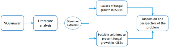 After exploring the research trend through the VOSviewer visual maps, a systematic literature review was conducted on the specific topic in the context of the last three years. The investigation was carried out by searching the Scopus database. In the first phase, the association of words “nZEB” and “fungi”, or “nZEB” and “mould”, was used, but very few results were obtained. Subsequently, the acronym “nZEB” was replaced with the full name “nearly Zero Energy Buildings” and the more general one “Zero Energy Buildings” to broaden the scope of research. However, the results remained limited. Consequently, to extrapolate a greater number of articles, the search was extended using the more general combination “Zero Energy Buildings” and “contaminants”, and “Zero Energy Buildings” and “Indoor Air Quality.” However, by limiting the field to the category of zero-energy buildings, the findings from the literature were reduced. Finally, the search was further enlarged by inserting the keyword “buildings” combined with the words “fungi”, “mold”, “dampness”, and “moisture.” Furthermore, a check was performed by removing the filter for the time period. However, only a few works completed prior to the period of the last three years were deemed particularly interesting to include in the expanded, final literature list. The literature was subsequently analyzed in detail, and the results are reported below.
